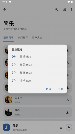 简乐音乐app最新版是一款非常不错的音乐播放软件,软件的界面布局十分简约,可以让用户轻轻松松地找到自己想要聆听的音乐。软件上的音乐非常多,各大音乐类型一应俱全,而且全程免费聆听,轻松满足用户对音乐的聆听需求。软件除了可以在线聆听之外,还可以离线聆听,如果选择离线聆听的话,那么用户必须先下载音乐才行,否则无法离线聆听。值得一提的是,下载音乐的时候,用户是可以选择音质,音质一共有四种,分别是流畅、标准、高品以及无损,每种音质带来的聆听效果也是截然不同,流畅最差,无损最好。