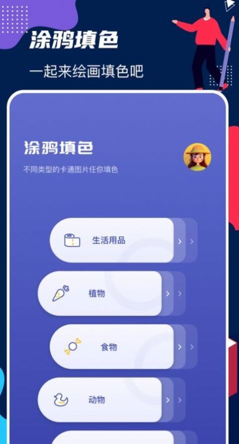 1、涂鸦填色里边能够选择不同种类的照片开展着色,你可以选择日常生活用品类,还可以选择植物类的,也有食材这些。