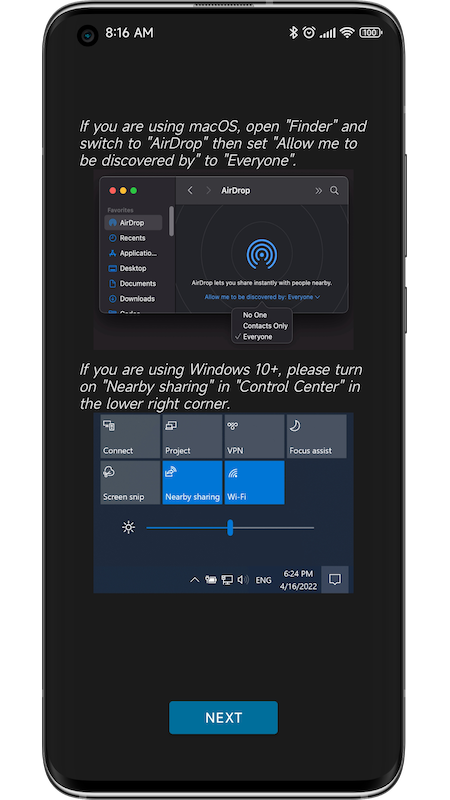 4、打开空中传送应用程序。如果需要连接和使用,请在访问过程中打开空中传送,将我的发现设置为所有人。