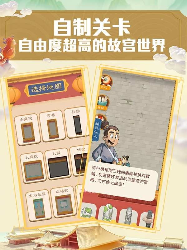 3、简单游戏操作模式,精致的故宫工程建筑,了解更多的的故宫专业知识,穿越古代,体会古代人的日常生活及其工程建筑。